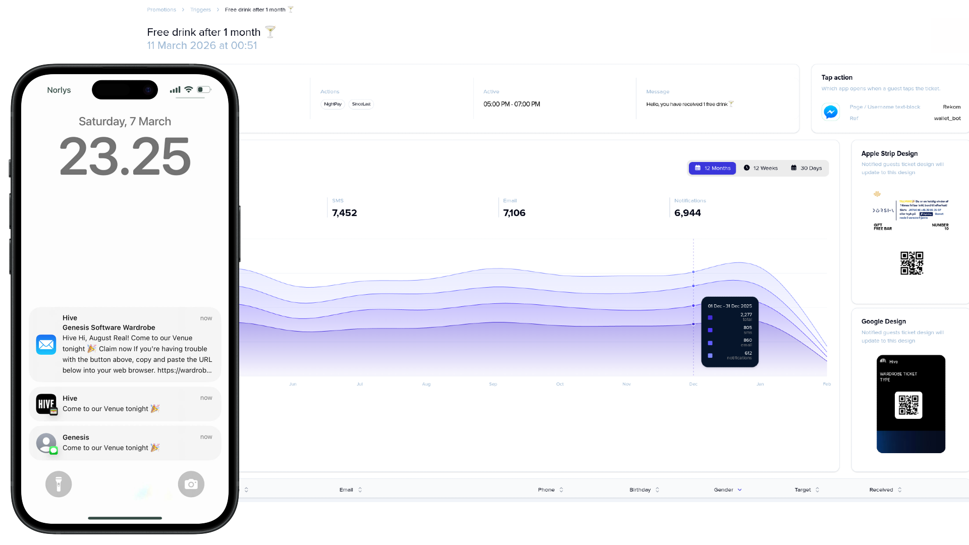 Send via wallet push notifications, SMS, or email — all from the same campaign builder. Reach guests where they actually look, not just their inbox.